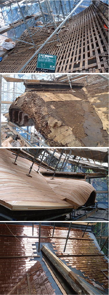 近年屋根の傷みや、建物の傾きが見られたため、長野県文化財保護事業補助金、辰野町文化財保護事業補助金、公営財団法人文化財保護・芸術研究助成金を受けて改修を実施しています。 拝殿・右廻廊は、屋根の傷み、軸の傾斜が見られたため、屋根の下地の修繕と、銅板の葺き替えを行いました。また、右廻廊は基礎の据え直しと建物締め直しを行い、傾きを修整しました。 神楽殿は、屋根の傷みと垂木の折損が見られたため、一部の野垂木の補強と、下地の修繕、銅板の葺き替えを行なっています。